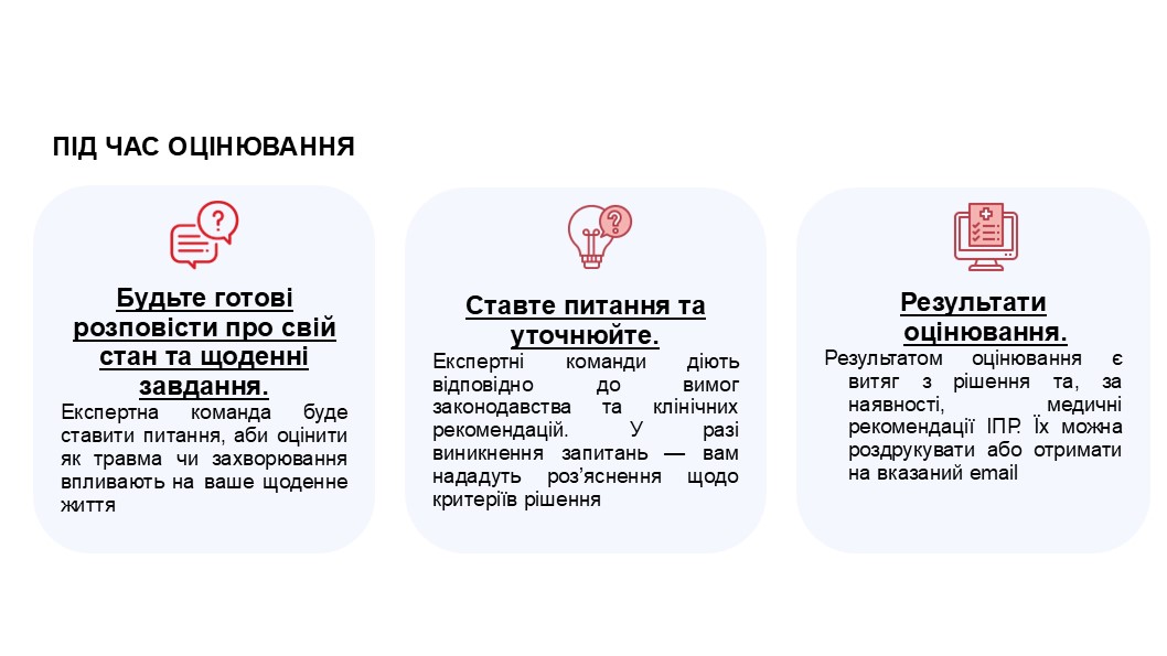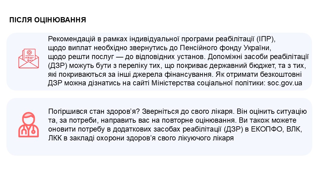 Мета оцінювання – не просто визначити групу інвалідності, а визначити потреби та можливості для якісного відновлення, лікування, реабілітації, соціальної інтеграції та економічної активності людини.